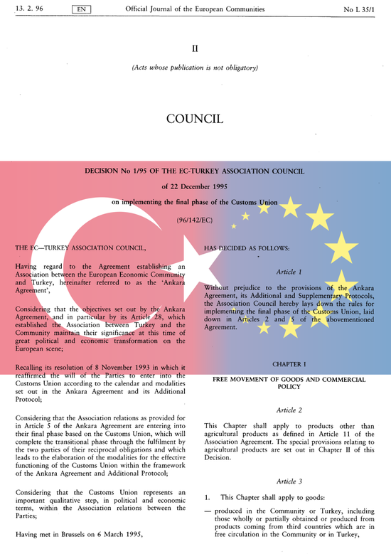 作为一个横跨欧亚两大洲的国家,土耳其一心想加入欧盟。但是直到今天,都没有成为欧盟成员国的希望。不过土耳其与欧盟的关系仍然十分密切,早在1995年,土耳其和欧盟就签订了土欧关税同盟协议,土耳其与欧盟之间,工业品基本零关税。