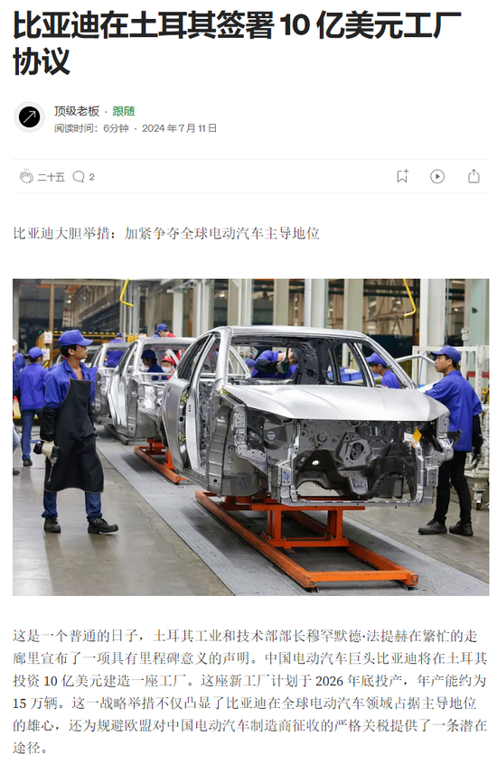根据新加坡媒体的报道,为了规避欧盟的高额反补贴税,中国电动车巨头比亚迪将在土耳其投资10亿美元,建设一家年产能为15万辆电动车的工厂,预计2026年投产。此外有消息称,广汽集团也在与土耳其方面谈判。