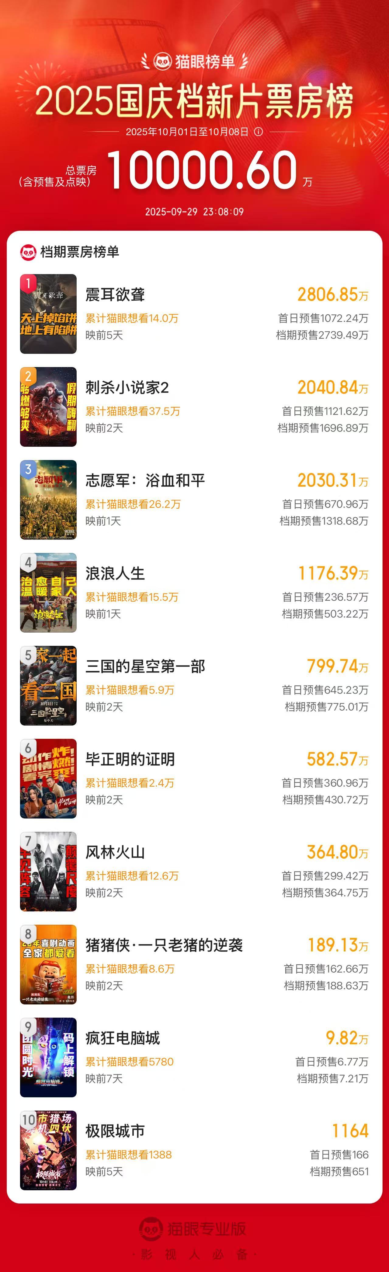 猫眼专业版数据显示,目前共有4部新片预售票房突破1000万元,《震耳欲聋》《刺杀小说家2》《志愿军:浴血和平》预售票房已超2000万元,《浪浪人生》预售票房超1000万元。其中,《志愿军:浴血和平》《浪浪人生》于9月30日率先上映,打响国庆档“前哨战”。